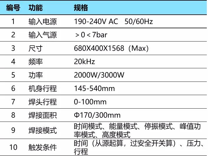 設備功率含20K2000W、3000W;內置超聲波振幅(功率)10-100%可調,適用于多種工件焊接;可以更換不同的模具,自動追蹤頻率范圍±500Hz。