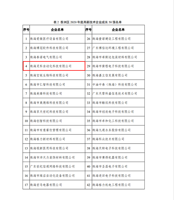 珠海市香洲區科技和工業信息化局發文公布《香洲區2020年度高企百強名單公示》。珠海靈科自動化科技有限公司(以下簡稱靈科超聲波)榮獲“香洲區2020年度高新技術企業成長50強”。