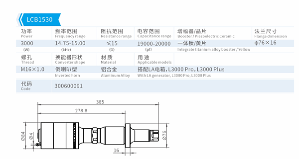 特點:換能器將高頻高壓信號轉換成機械振幅;不同的外形尺寸對應不同的功率;