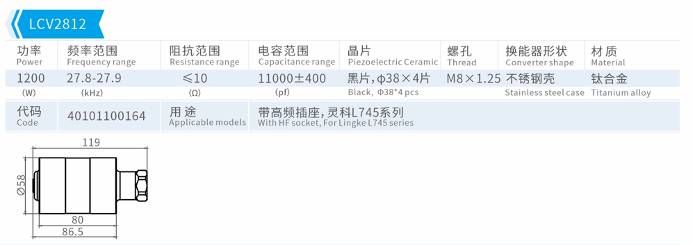 特點:換能器將高頻高壓信號轉換成機械振幅;不同的外形尺寸對應不同的功率;