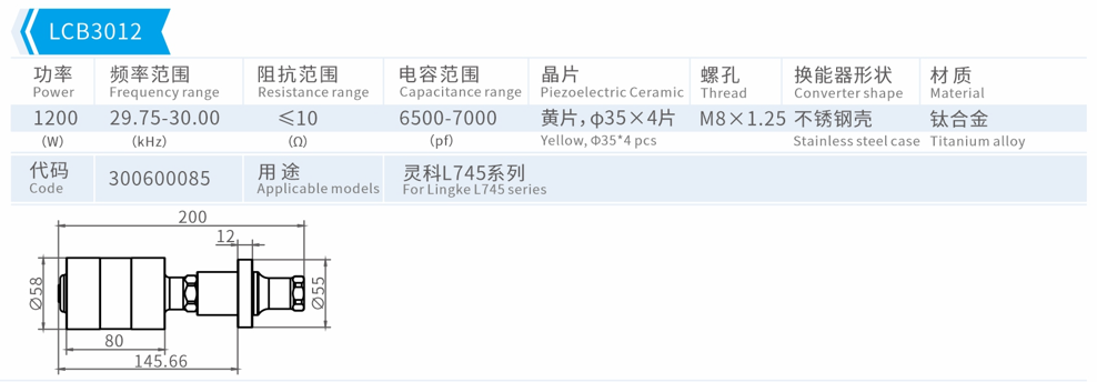 特點:換能器將高頻高壓信號轉換成機械振幅;不同的外形尺寸對應不同的功率;