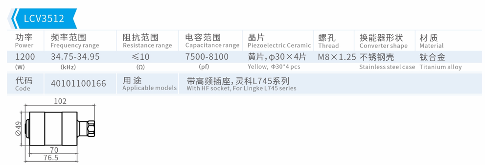 特點:換能器將高頻高壓信號轉換成機械振幅;不同的外形尺寸對應不同的功率;