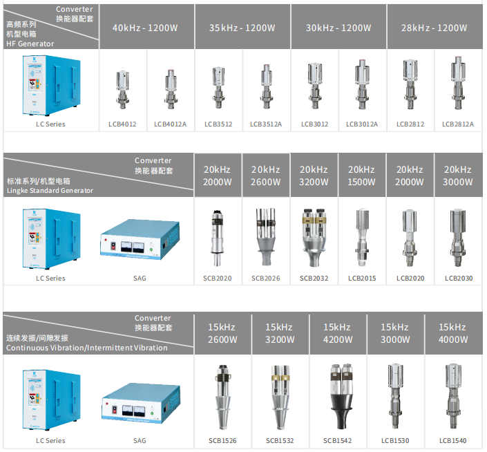 特點:換能器將高頻高壓信號轉換成機械振幅;不同的外形尺寸對應不同的功率;